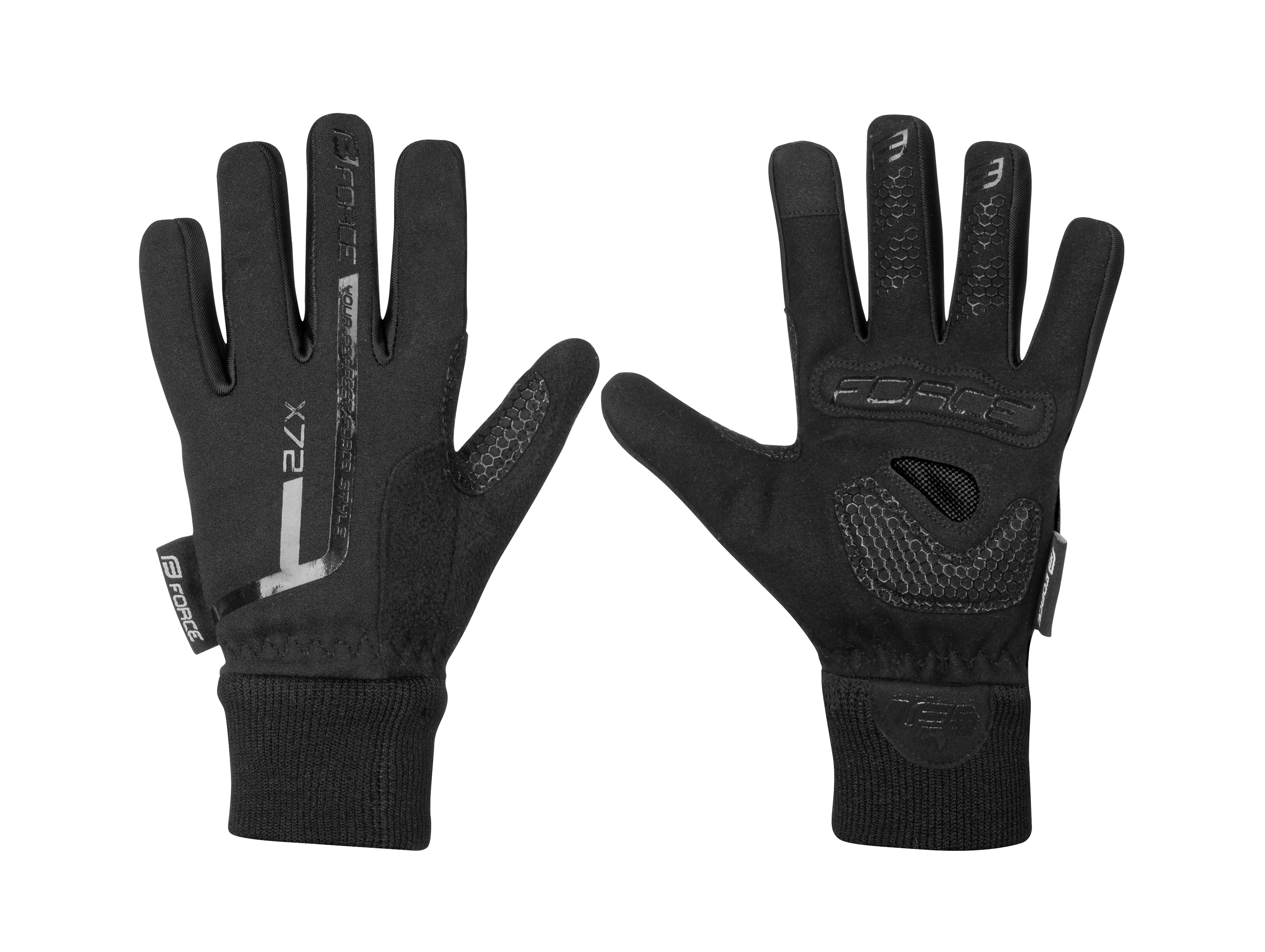 zimní cyklistické rukavice, unisex vhodné i pro ostatní sporty dlaň a některé prsty s protiskluznou úpravou široký elastický lem zápěstí materiál: 60% nylon, 30% polyuretan, 10% elastan baleno v sáčku s kartou FORCE